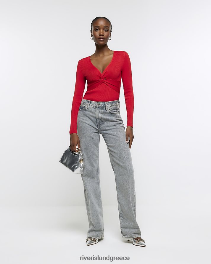 River Island ενδύματα το κόκκινο γυναίκες μπροστινό κόμπο μακρυμάνικο τοπ B6N8X137