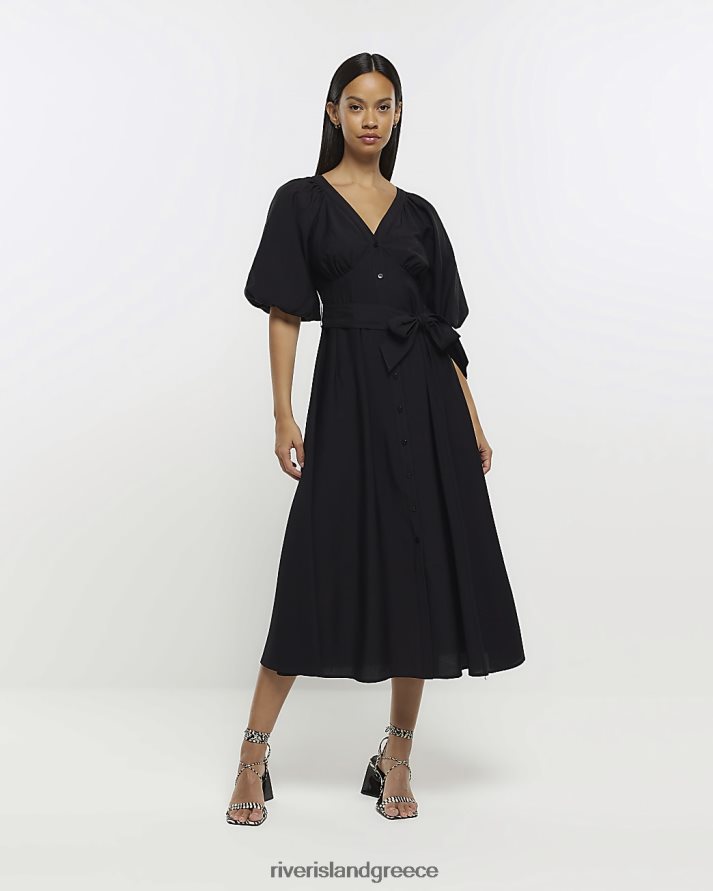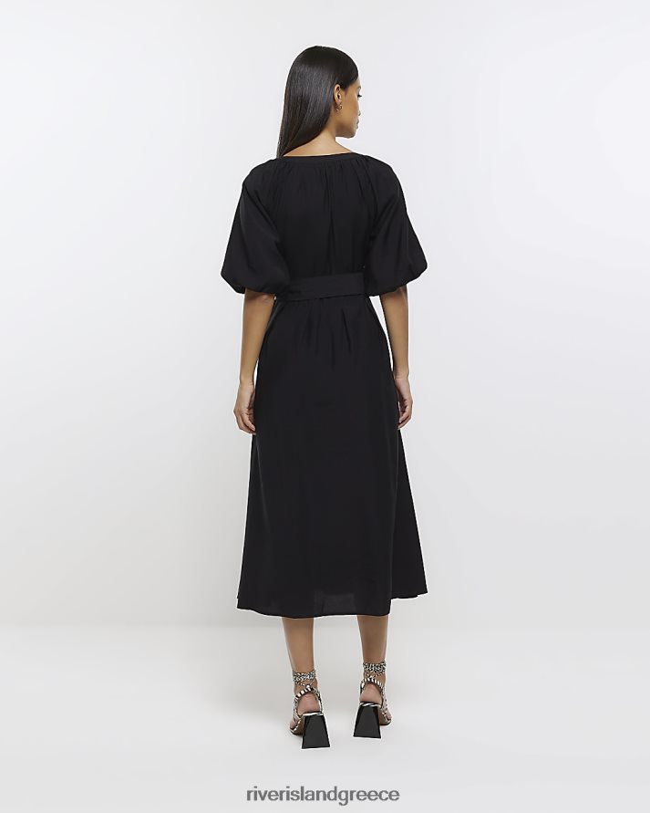 River Island ενδύματα μαύρος γυναίκες δέσιμο μέσης φουσκωτό μανίκι swing midi φόρεμα B6N8X4410