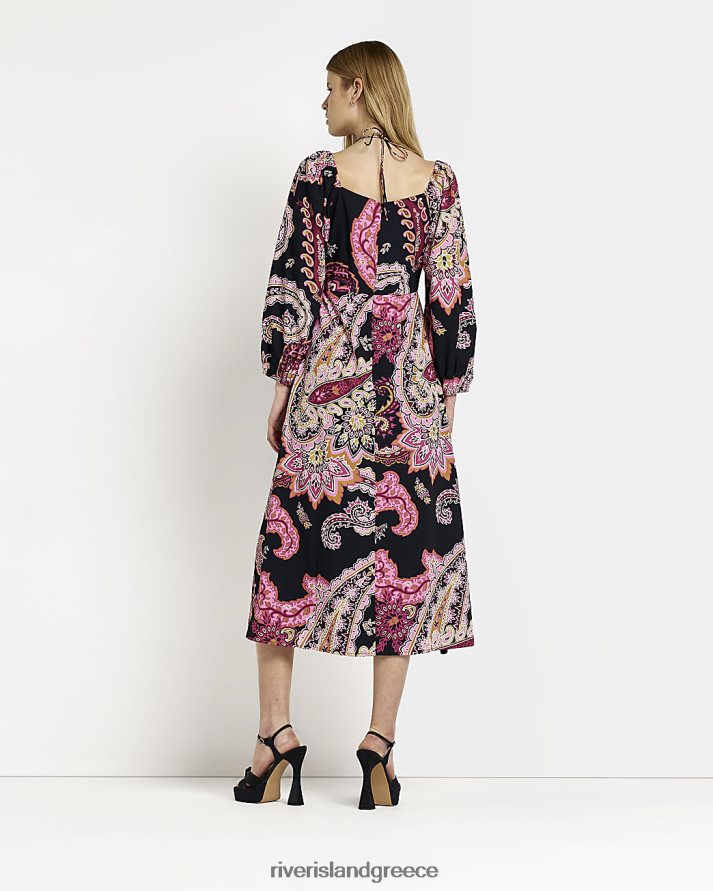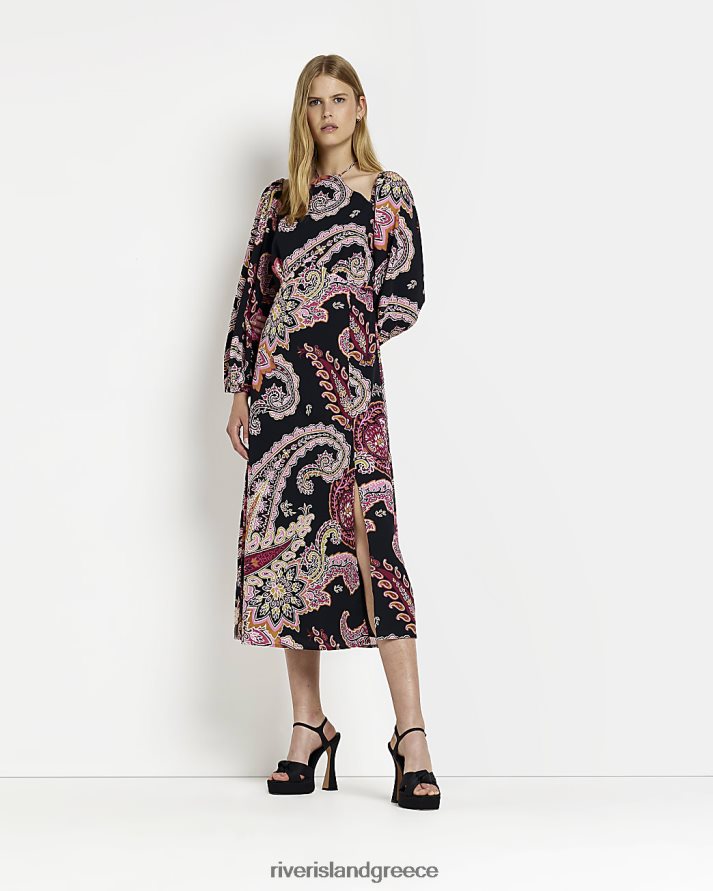 River Island ενδύματα μαύρος γυναίκες Μίντι φόρεμα με μακριά μανίκια paisley B6N8X2105