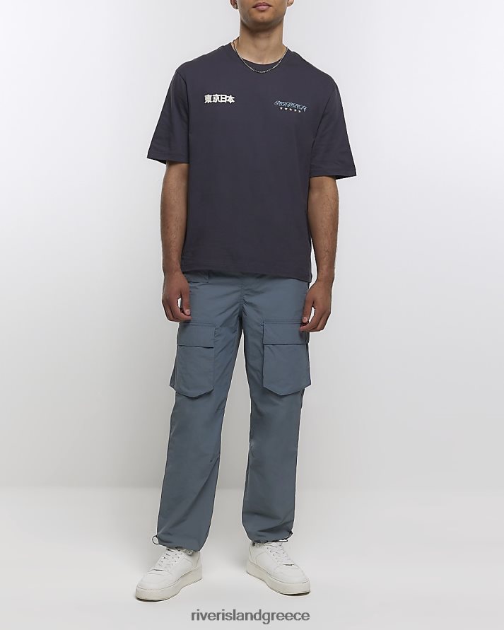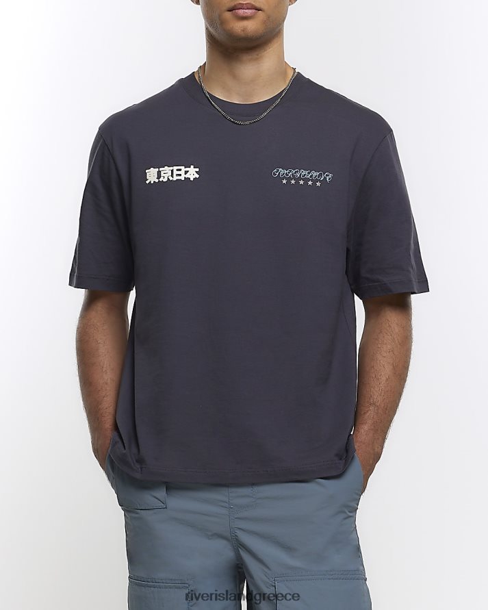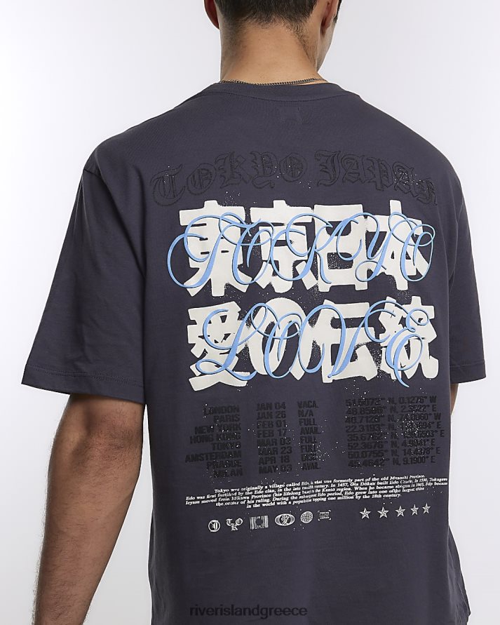 River Island ενδύματα γκρί άνδρες υπερμεγέθη εφαρμοστή ιαπωνική γραφική μπλούζα B6N8X5648
